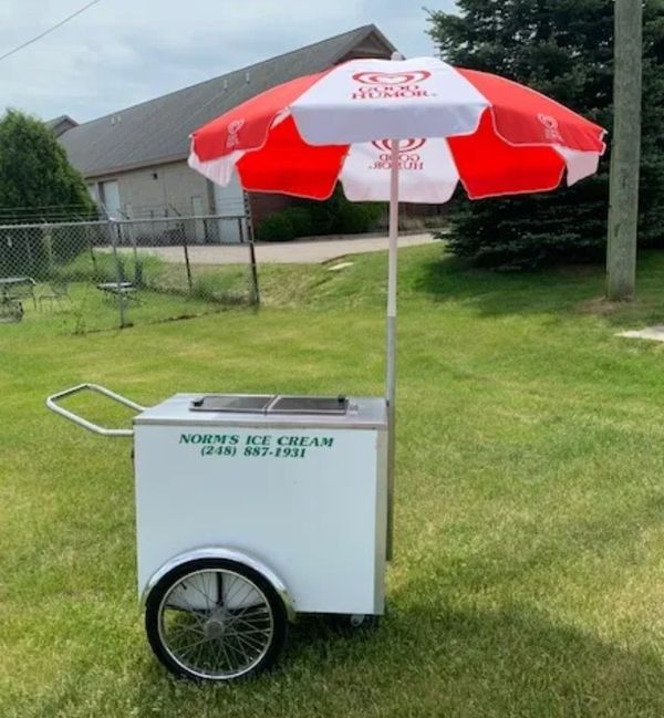 The cart is $135.00 plus tax. To hold your reservation, there is a non refundable fee of $135.00 plus tax. The cart rental includes dry ice, an umbrella, and magnets showing your product. You need to purchase at least 4 boxes of ice cream with your cart. You need a pick up truck or a trailer to transport the cart to and from your location, as we do not deliver.